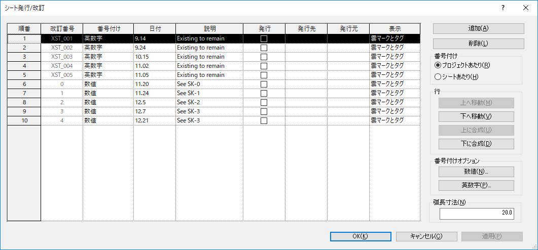 プロジェクトを 1 つの番号付けスキーム(数値など)を使用して開始することができます。プロジェクトの後工程で、異なる番号付けスキームを使用してプロジェクトの異なるステージを示すことができます。[シートの発行/改訂]ダイアログに一覧表示されたシーケンス番号は、個々の番号付けスキームに関係なく、すべての改訂で、全体のプロジェクトに基づいた順番を保持します。