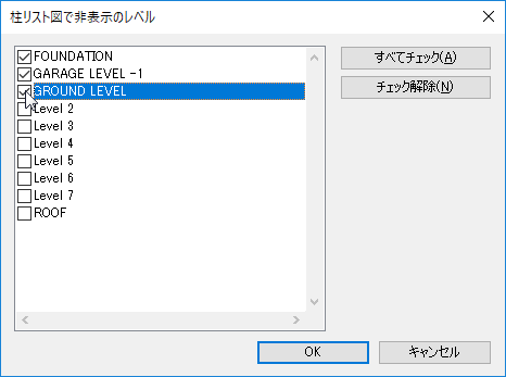 注: 柱リストでレベルを表示するには、該当するレベルのチェックをオフにし、そのレベルが柱リストビューの[上部レベル]/[下部レベル]の拘束内にある必要があります。上部レベル/下部レベルの拘束の詳細については、「