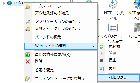 - [インターネット インフォメーション サービス]ダイアログ ボックスで、ローカル コンピュータ名 ► [サイト]を展開し、[既定の Web サイト]を右クリックします。次に、[バインドの編集]、[Web サイトの管理]、[詳細設定]の順にクリックします。