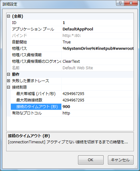 - [接続制限]を展開し、[タイムアウト]の値を 900 に変更して、[OK]をクリックします。