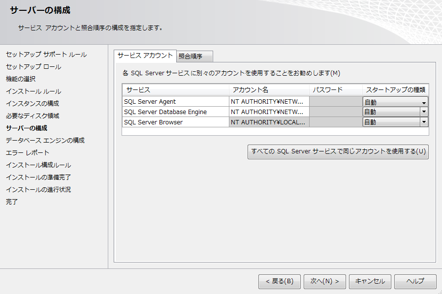 - [サーバの構成]ウィンドウで、[サービス アカウント]タブを選択します。