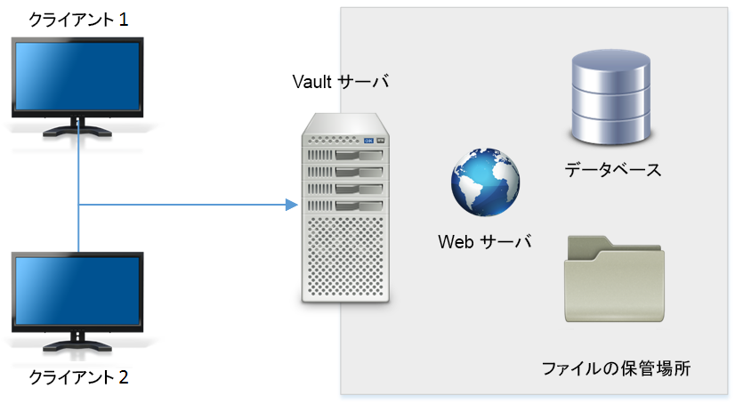 1 つの Vault 環境は、1 つの Vault サーバと 1 つ以上の Vault Client で構成されます。他のアプリケーションと統合される Vault Thick Client、Vault Thin Client、および Vault Add-in があります。ユーザは、Vault Office Thick Client をインストールすることもできます。