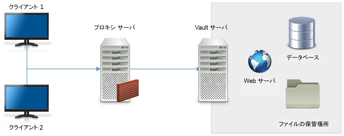 Vault サーバは、Web サーバ、データベース、ファイル保管場所の 3 つの主要なコンポーネントによって構成されています。コンポーネントの基本的な構成を図に示します。