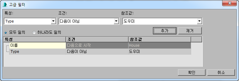 예를 들어 이름이 "House"로 시작하는 도우미 오브젝트 이외의 오브젝트만 표시하려면 다음과 같이 설정합니다.