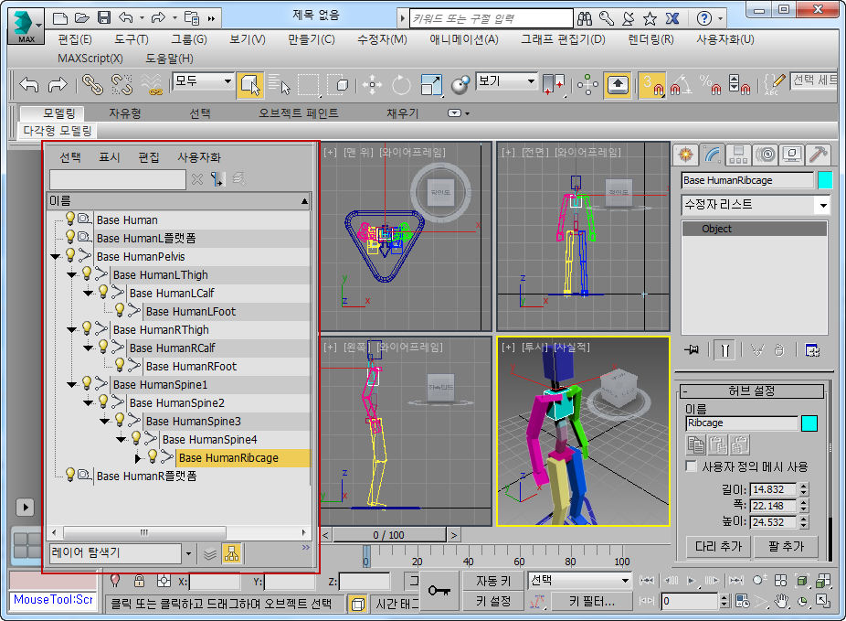 3ds Max 인터페이스에 고정된 작업 공간 장면 탐색기(빨간색 윤곽)