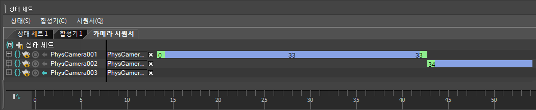 시퀀서 모드가 활성화되어 있는 동안 상태 세트 대화상자가 3ds Max 뷰포트 아래에 하나의 창으로 표시되며, 여기에는 사용 중인 카메라와 각 카메라가 활성화되는 프레임의 범위를 표시하는 트랙 창이 포함되어 있습니다