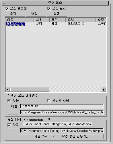 경고: 3ds Max에서는 Combustion에서 지원하지 않는 일부 파일 유형을 지원합니다. Combustion에서 사용하려면 요소를 EPS 파일로 렌더링하지 마십시오. 이 형식으로 렌더링하면 CWS 파일이 저장되지 않습니다. 지원되는 파일 형식에 대한 자세한 내용은 Combustion 문서를 참조하십시오.