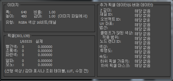 렌더링 출력에서 RPF 또는 RLA와 같은 추가 채널이 포함된 형식을 사용하는 경우 정보 팝업의 추가 픽셀 데이터 그룹에 이 데이터가 표시됩니다. 이 그룹에는 가능한 채널이 모두 포함됩니다. 채널이 없으면 값은 "해당 없음"을 나타내는 "N/A"로 표시됩니다.