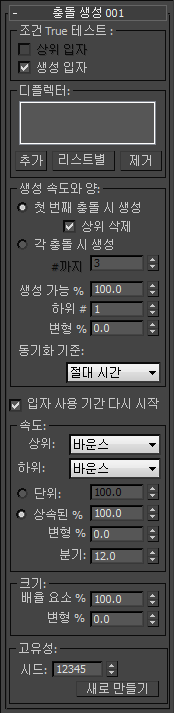 #까지생성된 파티클을 만드는 상위 파티클에 의한 최대 충돌 수입니다. 각 충돌 시 생성 옵션에만 사용할 수 있습니다. 기본값은 3입니다.