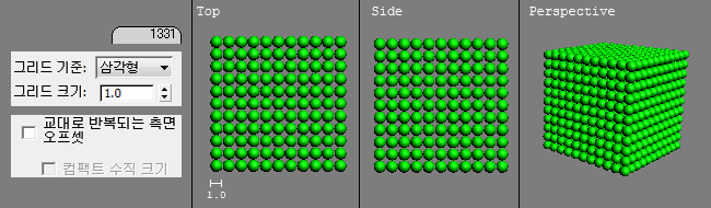 - 단일 그리드 레이어에서 사각형 또는 삼각형 레이아웃으로 파티클을 압축하는 방법을 선택합니다. 두 가지 선택 사항은 다음 그림의 위에서 보이는 대로 표시됩니다.