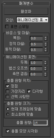 주: 모양(다음 참조)을 애니메이션된 표면 옵션으로 설정하면 세 가지 기본 충돌 원형 위치 옵션(정점, 가장자리 및 면) 중 하나 이상이 설정된 경우에만 활성화를 사용할 수 있습니다. 자세한 내용은 다음의 충돌 원형 위치 그룹을 참조하십시오.
