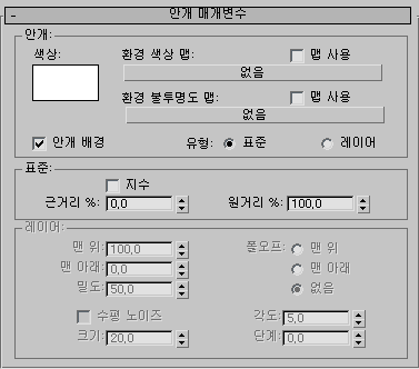- 표준을 선택하면 안개가 표준 그룹의 매개변수를 사용하고 레이어를 선택하면 안개가 레이어 그룹의 매개변수를 사용합니다.