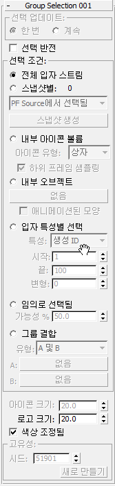 이러한 컨트롤은 임의로 선택됨 및 파티클 특성별 선택 선택 조건에 대해 임의화를 설정합니다.