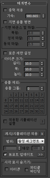 - 도우미 아이콘의 치수를 표준 단위로 설정합니다. 일반적으로 아이콘 크기는 시뮬레이션에 영향을 주지 않습니다. 중력 방향과 지면 충돌 평면을 표시할 뿐입니다. 단, 표준 제한 설정(이전 참조)이 설정된 경우는 예외입니다.