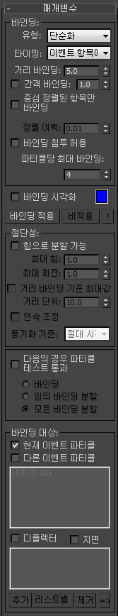 파티클당 최대 바인딩의 효과를 보여 주는 비디오는 파티클당 최대 바인딩을 참조하십시오.