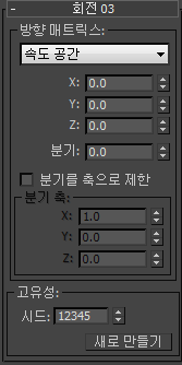회전 연산자는 이벤트 도중에 선택적 임의 변화와 더불어 파티클의 방향을 설정하고 애니메이션할 수 있도록 합니다. 5개 매트릭스 중 하나로 방향을 적용할 수 있습니다. 2개는 임의이고 3개는 명시적입니다. 일부 옵션의 경우 지정한 방향으로부터 임의의 변화율 또는 상이율을 설정할 수 있습니다.