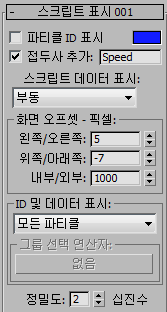 - - 이 값을 사용하여 파티클 위치(픽셀 단위)에 상대적인 스크립트 데이터의 위치 지정을 조정합니다. 다른 오프셋 값과 여러 스크립트 및 스크립트 표시 연산자를 사용하여 한 번에 여러 데이터를 표시할 수 있습니다(위치, 속도, 배율 등).