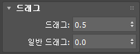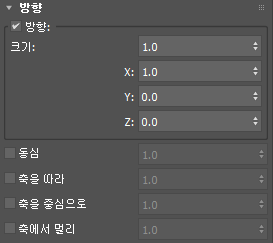 - 방향 벡터를 따라 m/s2 단위의 가속을 설정합니다. 이 값을 0으로 설정하여 기본 방향력을 해제하고 다른 옵션을 계속 사용하여 다른 방향의 가속을 제어할 수 있습니다. 방향을 반전하려면 음수 크기를 사용합니다.