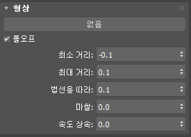 최소 거리가 최대 거리보다 클 경우 효과는 메시의 볼륨 외부에 적용됩니다. 폴오프가 최소 거리보다 큰 경우 전체 효과가 적용되고, 최대 거리보다 작은 경우에는 효과가 적용되지 않으며, 두 값 사이인 경우에는 선형 폴오프가 적용됩니다.