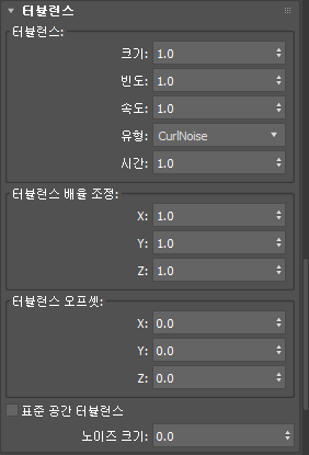 - 파티클 속도에 임의의 노이즈와 분기가 없는 터뷸런스를 적용하는 터뷸런스 롤아웃을 표시합니다.