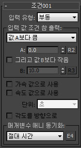 - 입력 유형=각도인 상태에서 이 확인란을 설정하면 파티클 흐름이 회전 속도(프레임, 초 또는 틱 단위)로 입력 값을 비교합니다.