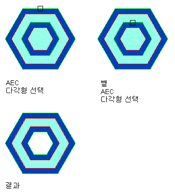 다음 절차에 따라 AEC 폴리곤에 구멍을 작성하기 위해 AEC 폴리곤을 다른 AEC 폴리곤에서 빼십시오. 이것은 예를 들어, 커튼월 채우기의 복잡한 패턴을 작성하는 데 유용합니다.