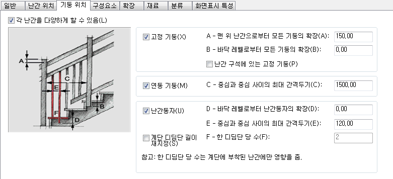 | 각 계단 디딤단의 난간동자 개수 재지정 | 계단 디딤단 길이 재지정을 선택합니다. 그런 다음 디딤단별 개수에 값을 입력할 수 있습니다. 이것은 계단에 부착된 난간에만 적용됩니다. |