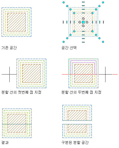 다음 절차에 따라 부속건물 선을 사용하여 돌출된 3D 공간 하나를 여러 개의 작은 공간으로 분할하십시오. 공간은 선에서 분할됩니다.