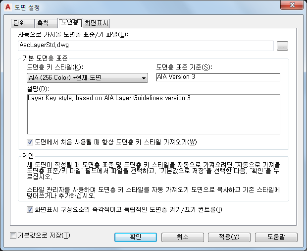 도면 설정 대화상자의 도면층 설정입니다. 도면층 키 스타일이 자동 가져오기로 설정되고 기본값으로 저장이 선택되어 있는지 확인합니다. 그러면 템플릿을 사용하지 않고 도면을 시작한 경우에라도 올바른 도면층 키 스타일이 로드됩니다. 또한 도면에서 처음 사용될 때 항상 도면층 키 스타일 가져오기가 선택되어 있는지 확인해야 합니다. 이 설정은 도면 기반 설정이며 템플릿에서 설정되어야 합니다. 이 설정은 가장 최근의 도면층 키 스타일이 이미 실행 중인 도면에서도 사용됨을 확인합니다.