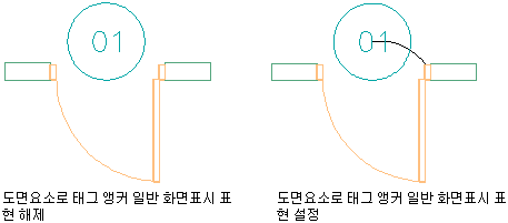 다음 절차에 따라 일람표 태그와 객체 사이의 현재 링크를 표시하십시오. 많은 태그가 있으며 태그가 어떻게 부착되어 있는지 잘 모르는 경우 이 링크를 표시하는 것이 유용합니다. 이 과정에서는 현재 뷰에서 도면요소로 태그 앵커 및 도면요소에 연장된 태그 부착에 대한 일반 화면표시 표현을 설정합니다.