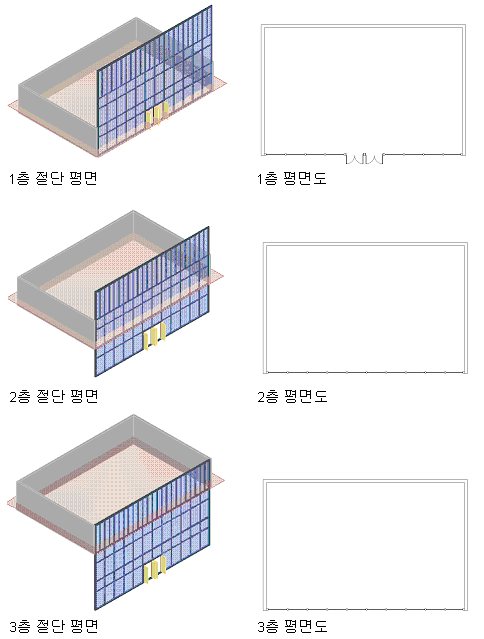 다음 이미지는 세 개의 레벨에 걸쳐 있는 커튼월을 보여줍니다. 왼쪽의 이미지는 연관된 레벨 도면에 대한 절단 평면을 나타냅니다. 오른쪽 평면도는 커튼월이 각 레벨에서 평면도에 표시되는 방법을 보여줍니다. 다양한 평면도에 있는 서로 다른 모양의 문 및 멀리언을 확인하십시오.