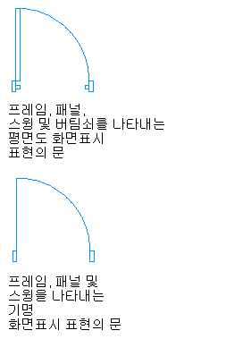 단일 객체는 서로 다른 도면 유형의 필요에 따라 다양한 방법으로 그려질 수 있습니다. 예를 들어 평면도 화면표시 표현은 문 패널, 프레임, 버팀쇠 및 스윙 구성요소를 그리고 기명 화면표시 표현은 문 패널, 프레임 및 스윙 구성요소를 그립니다. 두 가지 표현은 모두 문 패널을 그리지만 그려지는 방법은 서로 다릅니다. 평면도 표현은 문 패널을 직사각형으로 그리고, 기명 표현은 문 패널을 단일 선으로 그립니다.