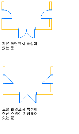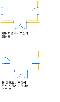 재료를 사용하여 화면표시를 조정하지 않는 경우, 화면표시 표현에 대한 화면표시 특성을 변경하여 객체 모양을 사용자화합니다. 예를 들어, 평면도 화면표시 표현에 문 스윙을 끄고, 스윙이 직선인지 호인지 지정하며, 퍼센트 개구부를 지정하고 스윙의 도면층, 색상 및 선종류를 변경할 수 있습니다.