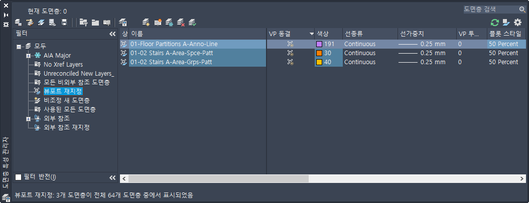 - 명령행에 VPLAYEROVERRIDES를 입력하여 현재 뷰포트에 도면층 특성 재지정이 있는지를 확인합니다. VPLAYEROVERRIDES가 1이면 뷰포트에 재지정이 있는 것입니다.