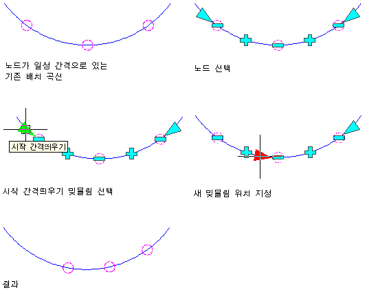 그립을 사용하여 배치 곡선의 시작 간격띄우기 노드 위치 변경