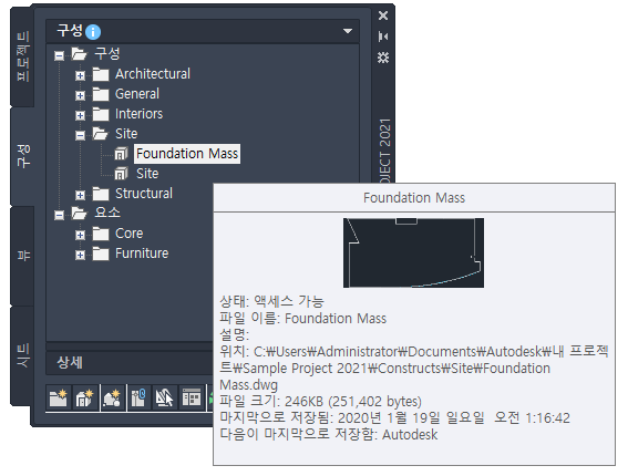 프로젝트 네비게이터에서는 프로젝트 도면의 썸네일 미리보기를 표시할 수 있습니다. 미리보기는 그래픽이나 상세 정보 또는 이 두 가지의 조합일 수 있습니다. 여러 도면이 있는 큰 프로젝트를 탐색하는 경우 썸네일을 표시하면 유용할 수 있습니다.