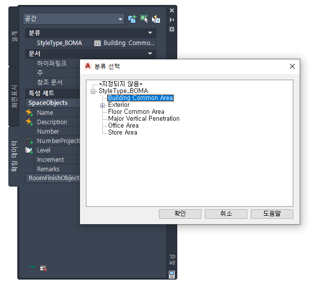 예를 들어 도면에 BOMA 영역 계산 표준을 선택한 경우 BOMA 분류 정의가 표시됩니다.
