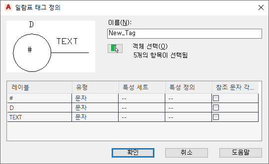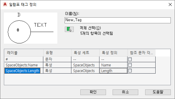 다음 절차에 따라 도면의 특정 객체에 대한 특성 세트 데이터를 캡처하고 표시하는 일람표 태그를 작성하십시오.