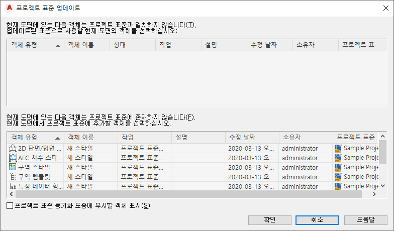 주: 프로젝트 도면에서 프로젝트 표준을 변경하기 전에 절차가 올바른지 확인해야 합니다. 자동 동기화를 선택한 상태에서 프로젝트 표준을 변경하면 다음 프로젝트 동기화 중에 모든 프로젝트 도면에서 해당 스타일 또는 화면표시 설정이 업데이트됩니다.