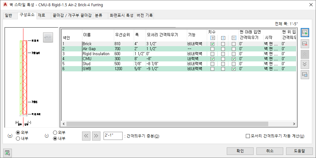 벽 스타일의 각 구성요소는 중공 벽의 에어 갭을 포함한 벽 또는 벽 재료의 구조적 구성요소에 해당합니다. 벽 구성요소를 작성할 때 구성요소의 다음과 같은 특징을 지정합니다.