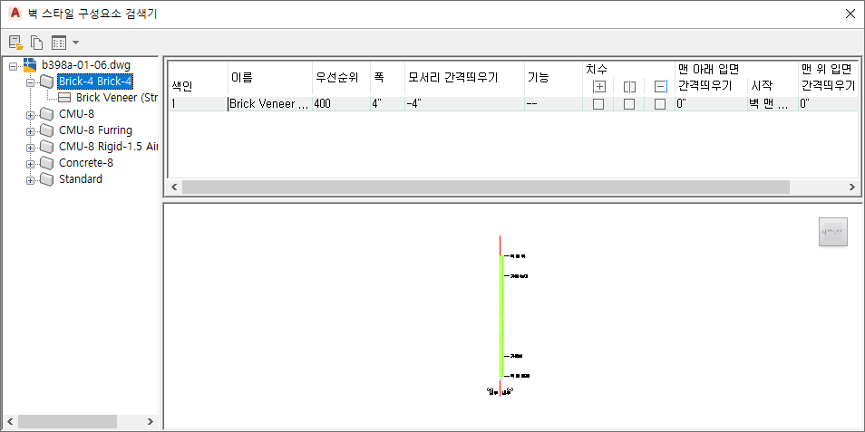 각 특성을 지정하여 벽 구성요소를 작성하면서, 다른 벽 스타일의 구성요소를 벽 스타일으로 복사할 수 있습니다. 벽 구성요소 브라우저는 다른 벽 스타일의 구성요소를 본 다음 편집 중인 벽 스타일에 구성요소를 복사할 수 있도록 해주는 유틸리티입니다.