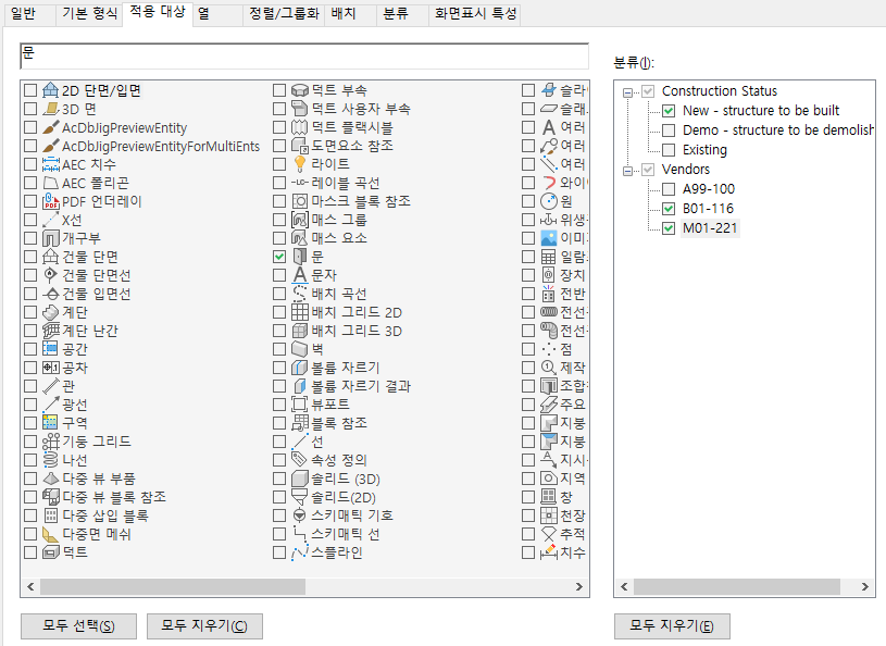 다음 절차에 따라 일람표 테이블 스타일에서 작성된 일람표에 객체가 포함되기 위해 충족해야 할 분류 기준을 지정하십시오. 하나의 객체 유형에 둘 이상의 분류를 지정할 수 있습니다.