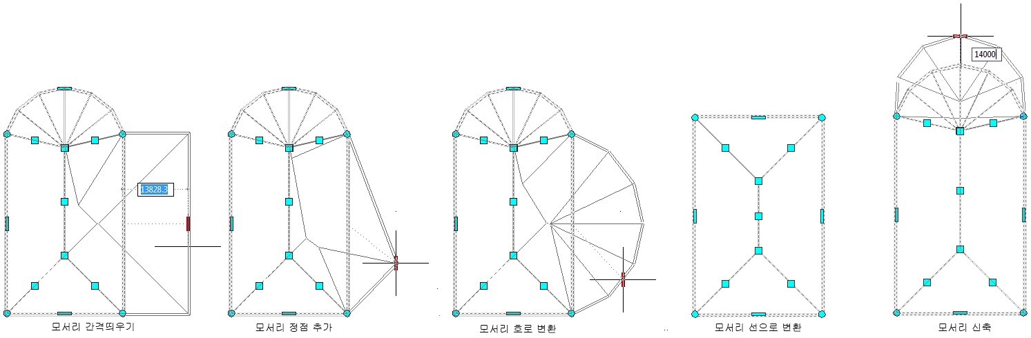 모서리 그립에는 간격띄우기, 정점 추가, 호로 변환, 선으로 변환 및 신축의 5가지 편집 모드가 있습니다.