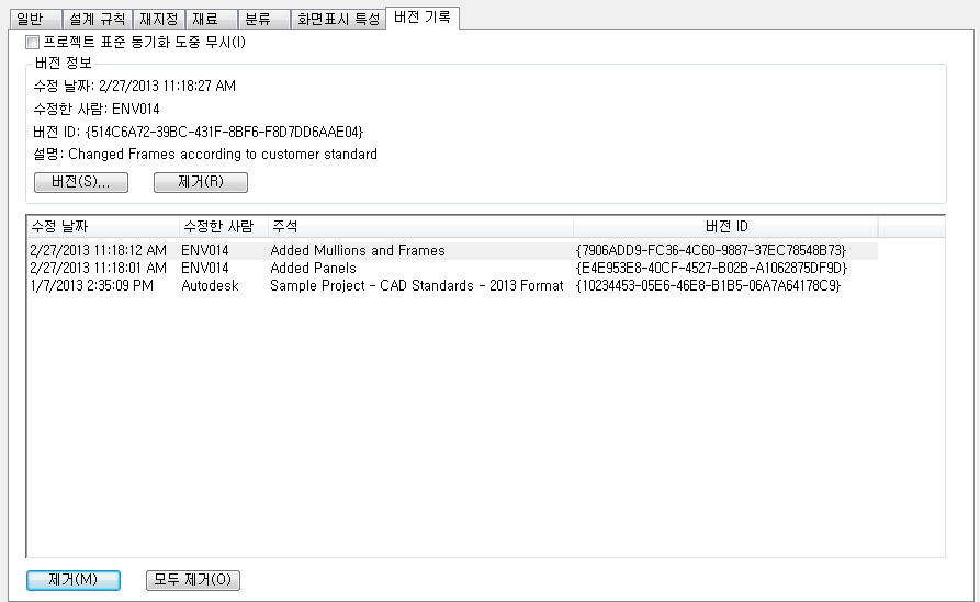 프로젝트 표준 도면의 각 스타일 및 화면표시 설정에는 버전 기록이 있습니다. 버전 기록에는 GUID(고유한 버전 식별자), 수정 날짜 및 시간, 사용자 이름, 사용자가 입력한 추가 설명이 표시됩니다.