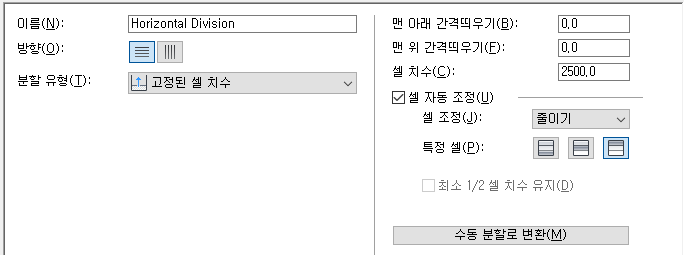 그리드에서 고정된 셀 크기를 지정할 때, 그리드의 셀이 남은 공간을 수용하도록 조정하는 방법을 조정할 수 있습니다. 이 공간은 커튼월 단위의 길이(또는 높이)를 셀의 고정된 크기로 균등하게 분할할 수 없는 경우 나타납니다.