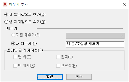 | 셀 재지정으로 추가하고 도면에 있는 스타일과 다른 스타일의 문 또는 창을 삽입한 다음 객체 주위의 프레임 모서리 제거하지 않기 | 새 채우기를 선택하고 객체 이름을 입력한 후 확인을 클릭합니다. |