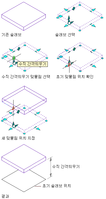 다음 과정에 따라 3D 등각투영 뷰에서 슬래브 또는 지붕 슬래브 객체의 수직 및 수평 간격띄우기를 변경하십시오.