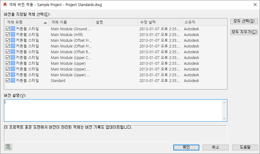 프로젝트 표준 도면에 있는 모든 스타일 및 화면표시 설정의 버전을 한 번에 관리할 수 있습니다.