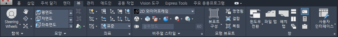 주: 뷰 탭에는 여러 명령이 들어 있으며 해당 명령은 응용프로그램 상태 막대에서도 찾을 수 있습니다.