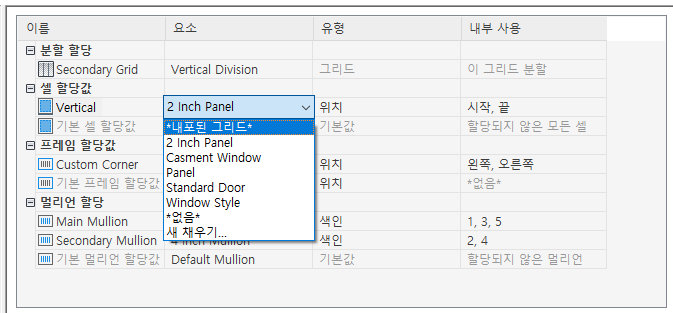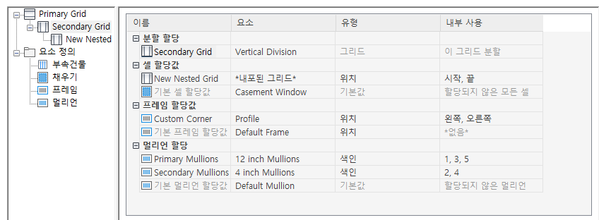 다음 과정에 따라 커튼월 단위에 내포된 그리드를 작성하십시오. 내포된 그리드는 그리드 내에 있는 그리드입니다. 내포된 각 그리드에는 자체 분할, 셀 할당값, 프레임 및 멀리언이 있습니다. 기본적으로 내포된 그리드에는 프레임이 선택되어 있지 않습니다.